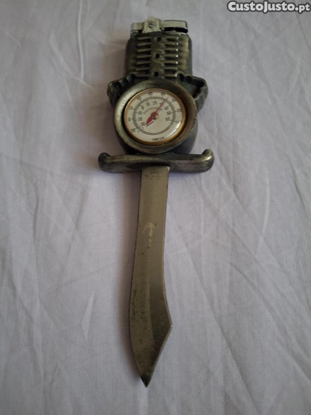 Objeto decorativo em estanho com isqueiro, termómetro e corta-papel. Nunca usado. Peça com 21cm de comprimento, ideal para compor uma decoração vintage ou industrial. Entrego pessoalmente ou posso enviar pelos CTT.