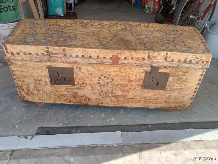 Bau antigo em madeira e forrado em pele de bovino, recuperado a cerca 6 anos, em bom estado. Entrego em Carcavelos/Parede.