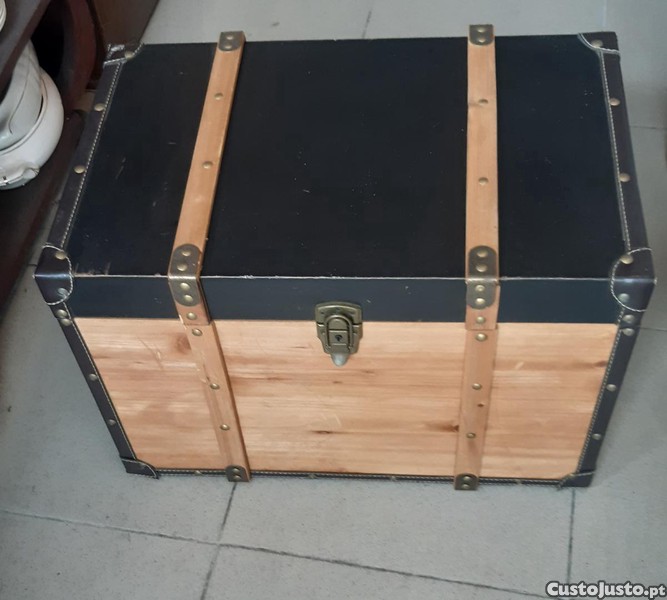 Lindo Baú em madeira, aplicações metálicas e em couro