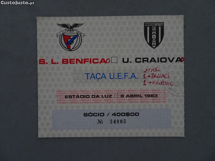 Bilhete de futebol Benfica U. Craiova Taca UEFA 1983