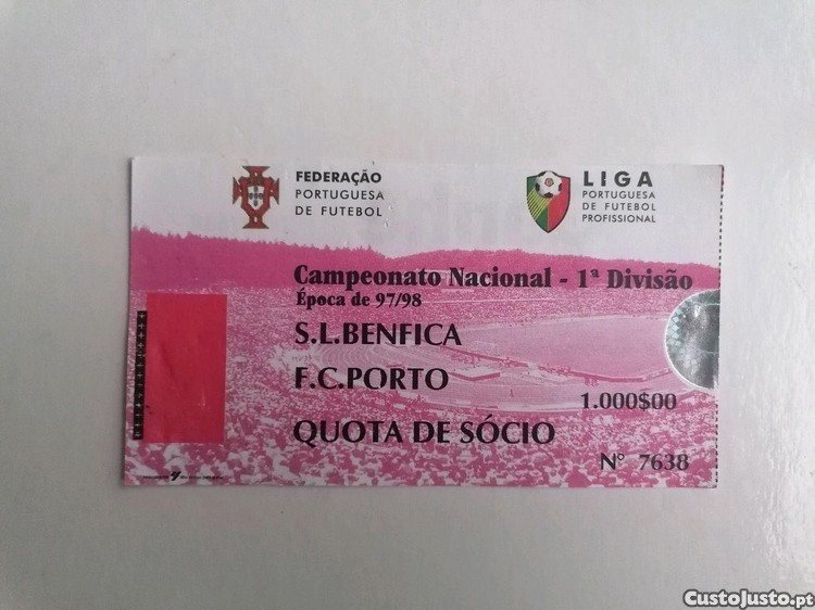 Preço: 10 €Bilhete de futebol jogo Benfica - F. C. Porto Campeonato Nacional 1a divisão Época 97/98