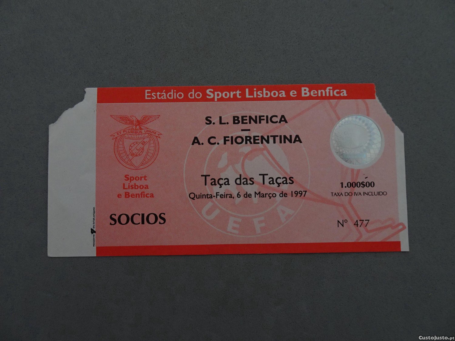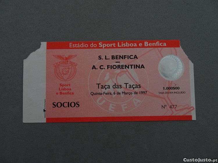 Preço: 5 €Bilhete futebol Benfica Fiorentina Taça das Taças 6 março 1997