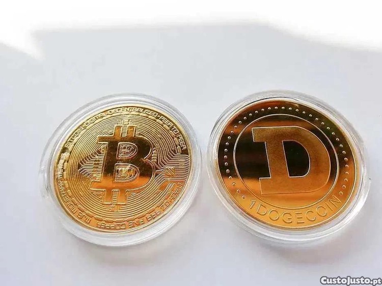 Comemorativa de criptomoedas Bitcoin e Dogecoin.