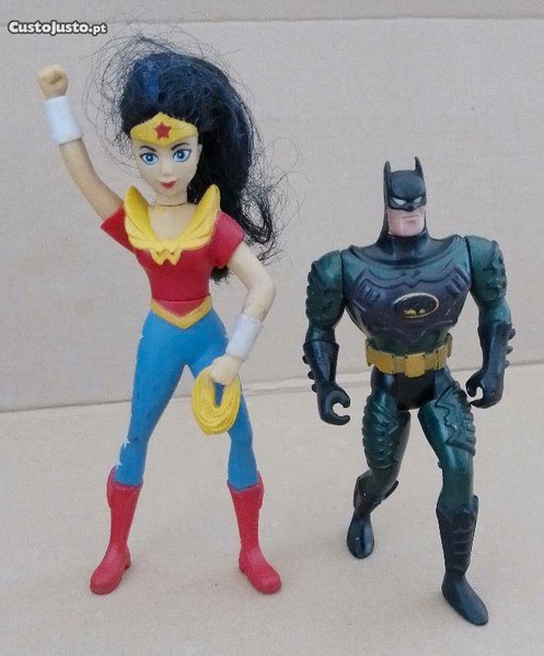 Conjunto de dois bonecos, um da Wonder Woman e outro do Batman. Ambas as personagens foram criadas pela DC Comic. A Wonder Woman trata-se de um brinde do Happy Meal da McDonald's do ano de 2016, tem 15 cm de altura e está em bom estado. O Batman mede 12 cm de altura, é do ano de 1994 e de fabrico independente. Não vendo em separado, só os dois juntos. Barato para desocupar. Negociável, vendo pela melhor oferta.