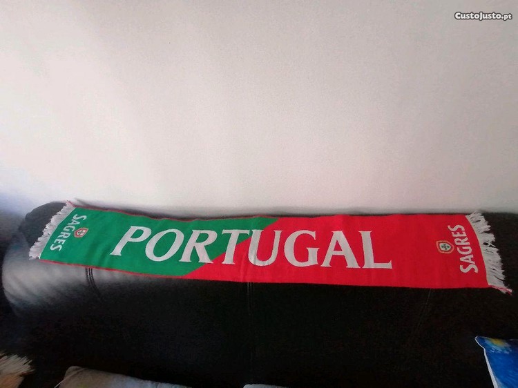 Cachecol de apoio a Portugal com publicidade da cerveja Sagres.