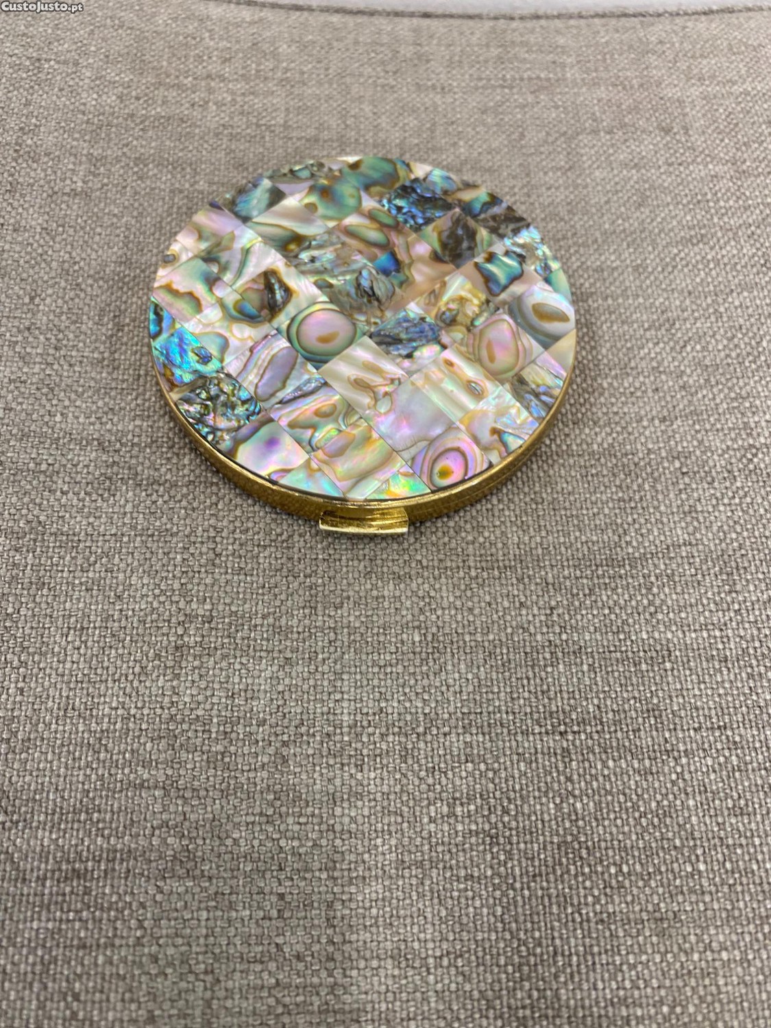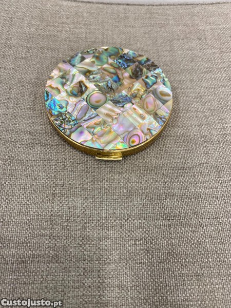 Linda caixa de pó de arroz antiga, com espelho e estojo,em madrepérola Abalone.
