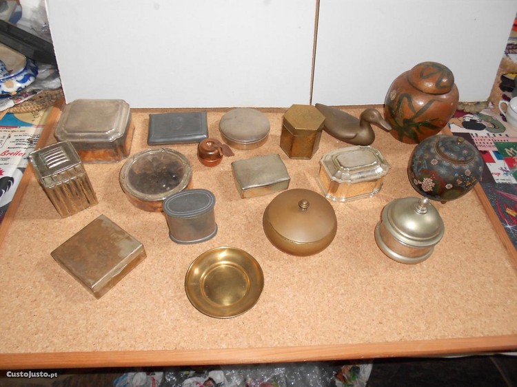Coleccao caixas, potes e outros artigos diversos em latao e estanho. Em bom estado embora alguns precisem de uma limpeza