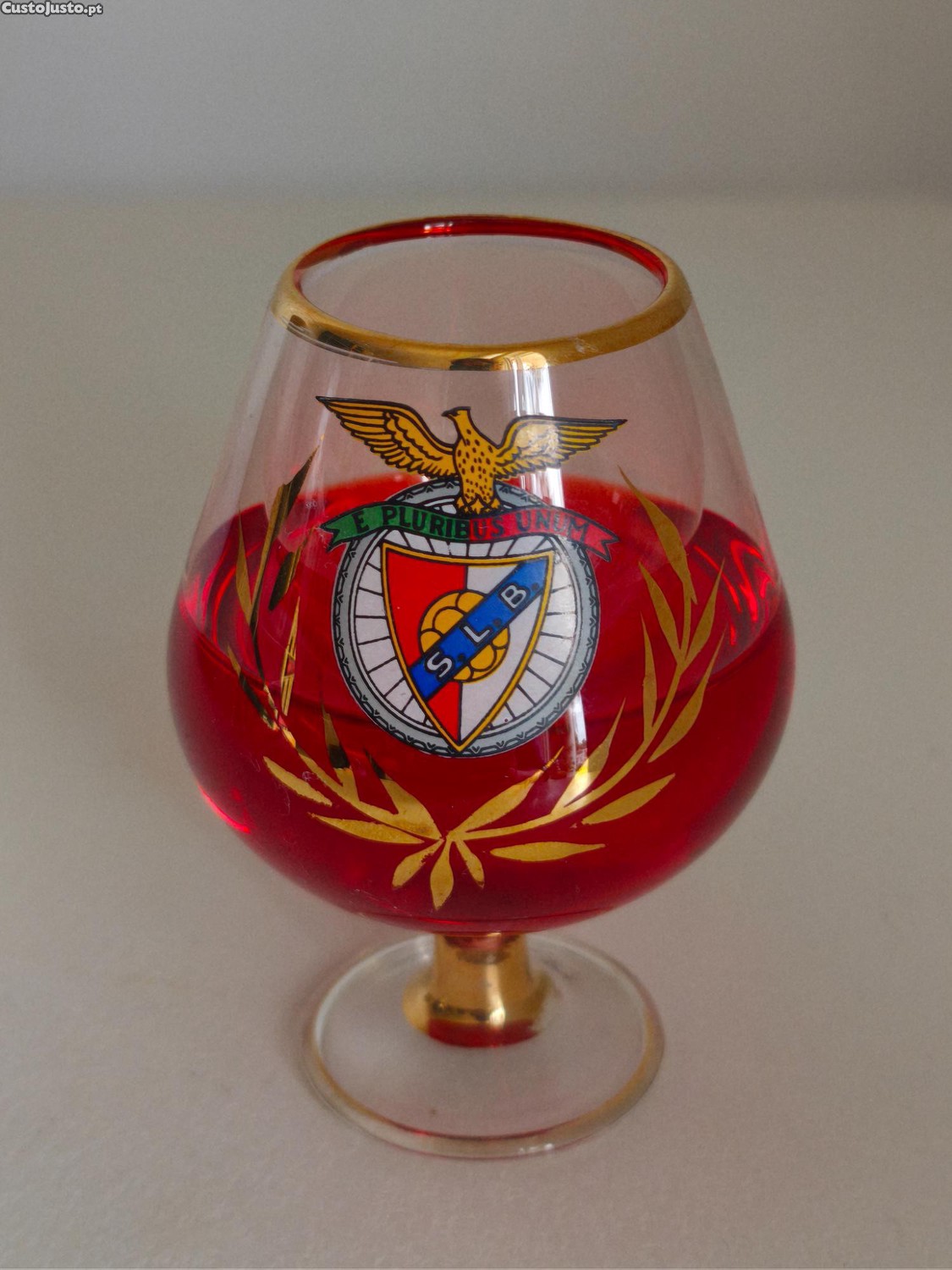 Cálice de vidro com líquido vermelho e decoração do Benfica. O copo apresenta o emblema do clube e detalhes dourados em torno da borda. É um item interessante para os fãs do Benfica. Entrego em mãos em Lisboa, Sacavém, São João da Talha, Ericeira ou Mafra. Custos de envio a cargo do comprador.