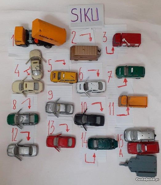 Carrinhos SIKU (fabrico Alemanha) 1 - Camionete (falta tampa atrás)-13cm 2 - VW LT 28 Kastenwagen (VENDIDO) 3 - Bombeiros-7,8 cm 4 - Audi A6 19 TDI-9cm (2 carros iguais) 5 - Opel Astra Caravan (ADAC)-8cm 6 - Mercedes Benz E 230 (Polizei)-8,5cm 7 - Mercedes Benz E 320 (Polizei)-8,5cm 8 - Audi A6 19 TDI (Polizei)-9cm 9 - Mercedes Benz C320 (Safeti car)-8cm 10- Merrcedes Benz S500 preto-8,5cm 11- Camionete amarela-7,6 cm 12- Jaguar S 4.0 V8-8,5cm 13- Mercedes Benz C 320 vermelho-8cm 14- Renault Megane Scenic RT 20-8cm 15- ATRELADO e : VW.SHaran-8,5cm (falta porta atrás) Mercedes Benz E290T-8,5cm Bombeiros (falta porta atrás) Entrego em Massamá Via CTT acresce portes