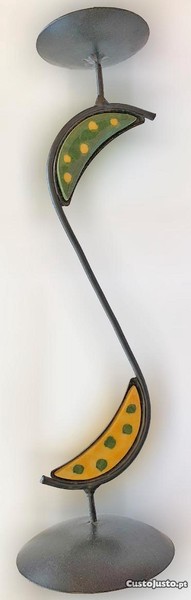 Castiçal africano muito original e único em artesanato composto por estrutura robusta em ferro preto escovado. Tem uma decoração simples, além do preto, possui apontamentos a verde e amarelo, simbolizando a natureza. Ideal para velas cilíndricas estreitas ou cónicas, pode perfeitamente adaptar-se a velas largas dado a sua base consistente. É um excelente e invulgar elemento decorativo, tanto para um ambiente no lar, como para um ambiente profissional na área das medicinas alternativas, pois confere sofisticação, requinte, calma e relaxamento, criando uma atmosfera exclusiva.