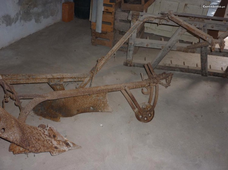 Duas charruas em ferro antigas e um arado em madeira e ferro também centenário. Estas alfaias antigas encontram-se no distrito de Santarém, concelho da Chamusca.