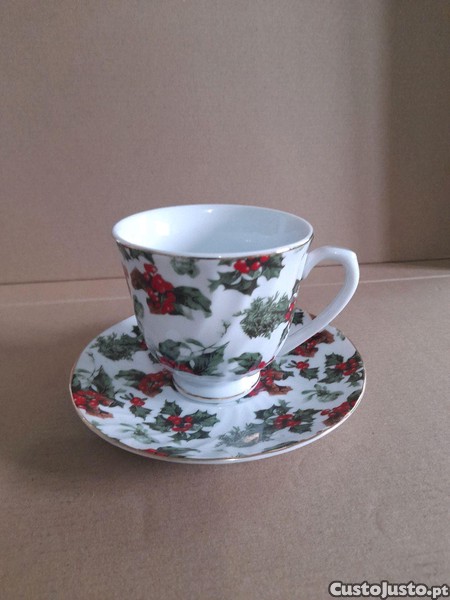 Chávena grande de cerâmica e respectivo pires, decorados com ramos, folhas e frutos de Azevinho, motivo alusivo ao Natal. A chávena tem 9 cm de diâmetro na parte mais larga e o pires tem 14,5 cm de diâmetro. O conjunto está novo, nunca foi usado e o preço anunciado é do conjunto. Barato para desocupar. Negociável, vendo pela melhor oferta.