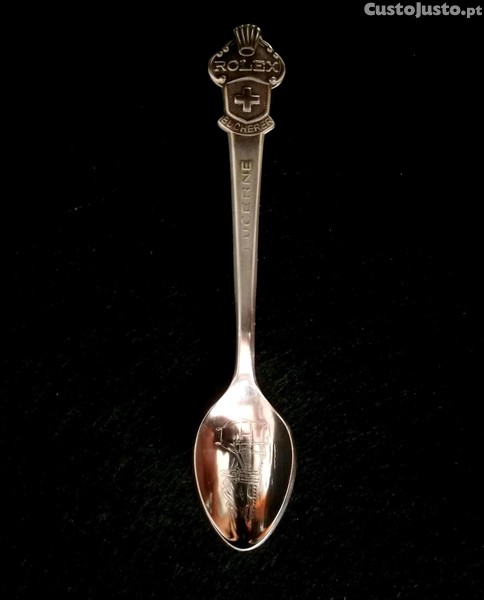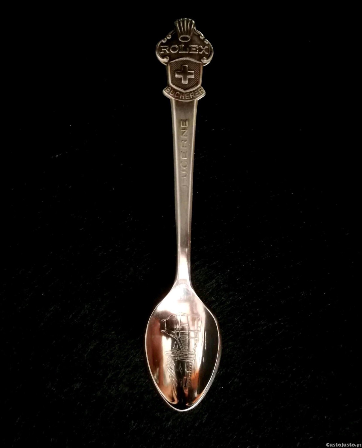 Colher de café com a gravação Rolex e Lucerne, fabricada desde os anos 50 pelo fabricante Bucherer of Switzerland como oferta aos compradores dos relógios Rolex.