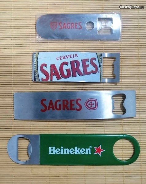Preço: 20 €Conjunto de 4 abre cápsulas em metal com a publicidade das marcas de cerveja Sagres e Heineken.
