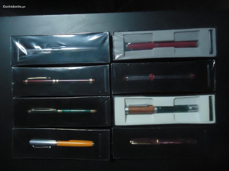 Ainda se encontram dentro das embalagens originais e com os cartuchos de tinta para usar. Estas 8 canetas são Iridium Point made in Germany. O preço é para o conjunto total das canetas. Entrego em mão na grande Lisboa. Também posso vender em separado cada caneta por 9 euros.