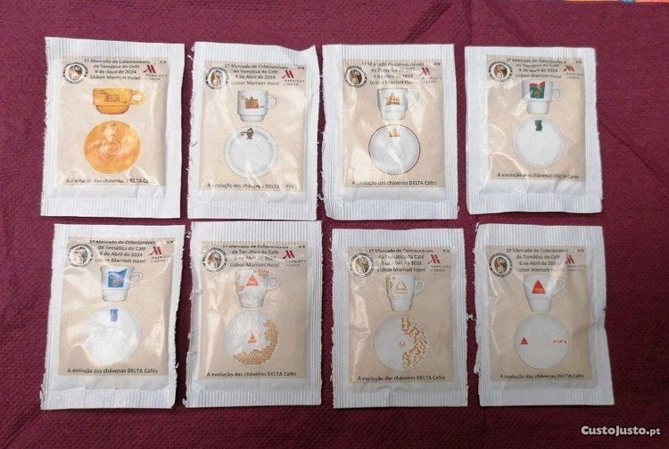 Conjunto de 8 pacotes de açúcar da Delta Cafés do 1 Encontro de colecionáveis da temática do café que teve lugar a 5 de Abril deste ano no Lisbon Marriot Hotel, que foi o patrocinador deste encontro juntamente com a Delta Café.