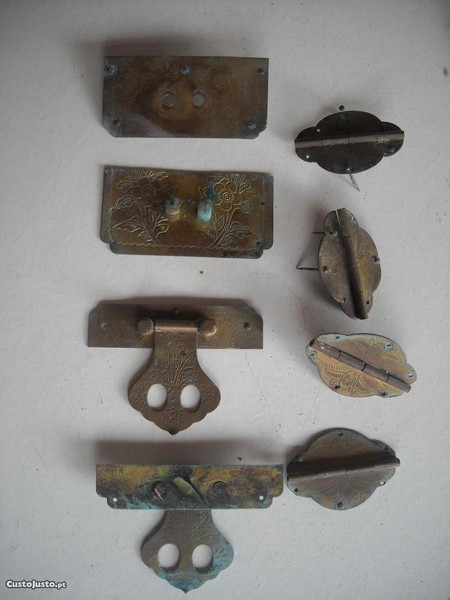 Conjunto fecho e dobradicas antigas latão para arca / bau / caixa pequena
