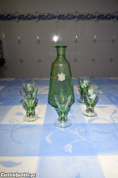 Conjunto antigo composto por Garafa e 5 Calices, em vidro verde, Pintados à Mão.