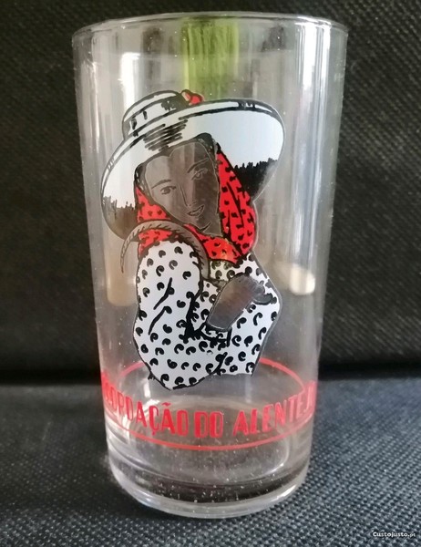 Preço: 6 €Copo antigo em vidro com a decoração de uma ceifeira e mencionando Recordação do Alentejo