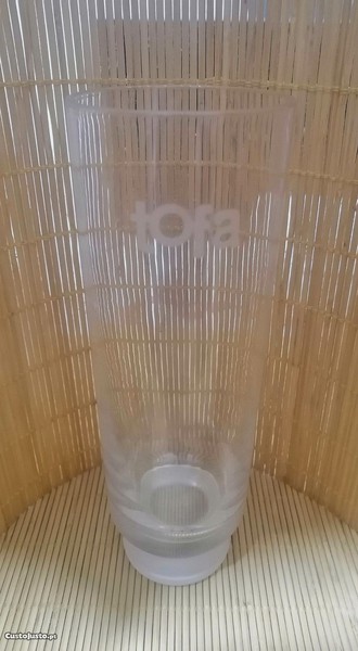 Copo antigo em vidro com publicidade da marca de cafés Tofa