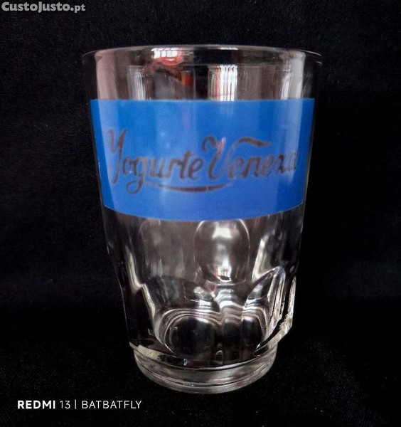 Preço: 8 €Copo antigo em vidro com publicidade dos Iogurtes Veneza com gravação a azul