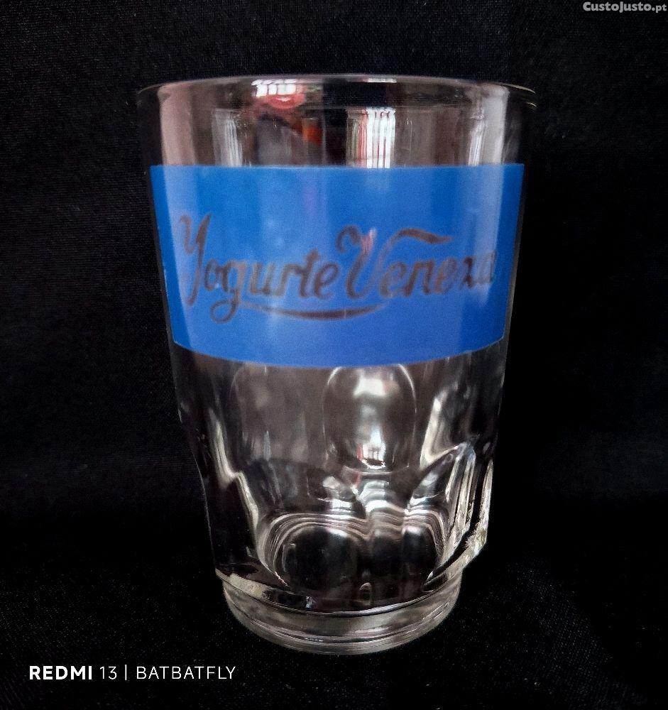 Copo antigo em vidro com publicidade dos Iogurtes Veneza com gravação a azul.