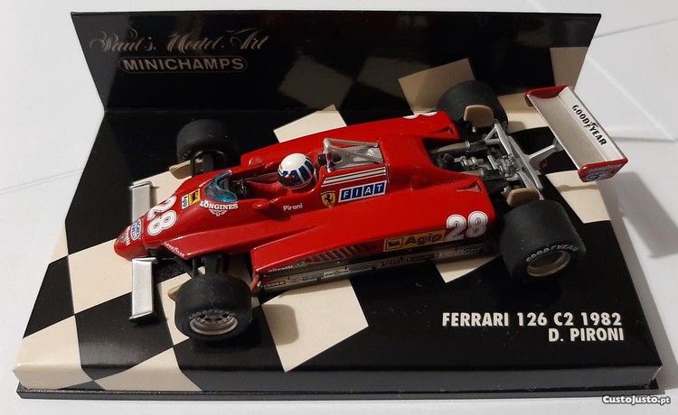 Miniatura de Fórmula 1 da marca Minichamps, na escala 1:43, do piloto Didier Pironi, carro Ferrari 126 C2 de 1982. Em muito bom estado.
