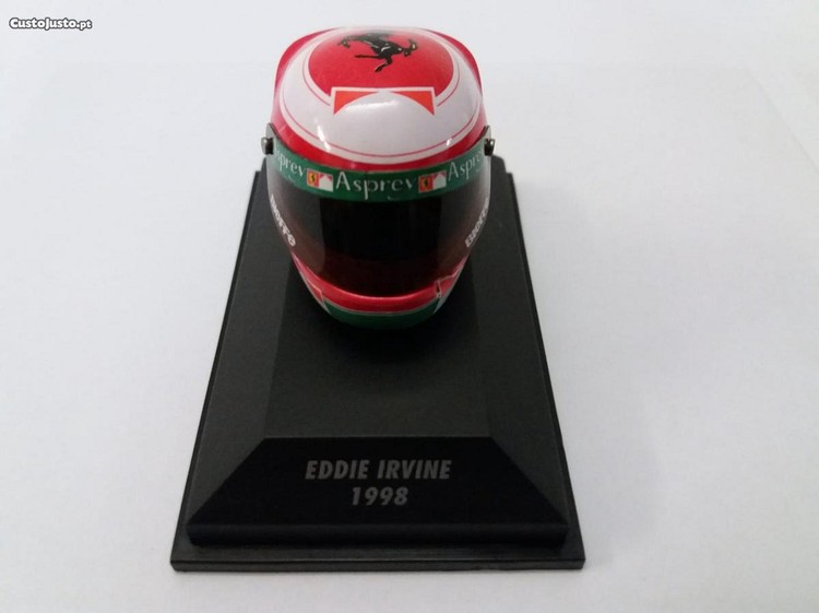 Miniatura de capacete da marca Minichamps, na escala 1:8, do piloto de Fórmula 1 Eddie Irvine. Temporada de 1998, quando estava na equipa Ferrari. Sem tampa. Em bom estado.