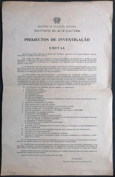 Edital do Ministério da Educação Nacional Instituto de Alta Cultura PROJECTOS de INVESTIGAÇÃO, datado de 13 de Novembro de 1970