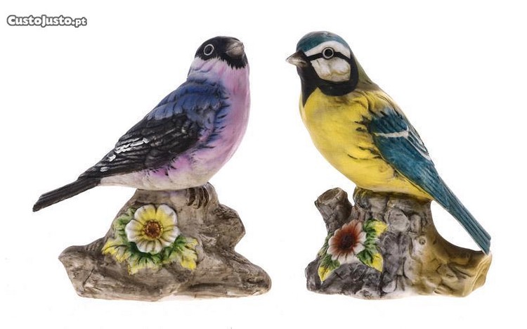 PAR DE PÁSSAROS EM BISCUIT - Com decoração policromada assentes em bases naturalistas. Dim: 14 cm (altura). Preço unitário. O conjunto por 75 euros. Excelente ocasião para oferecer uma prenda especial num dia festivo, ou simplesmente para colecionar.