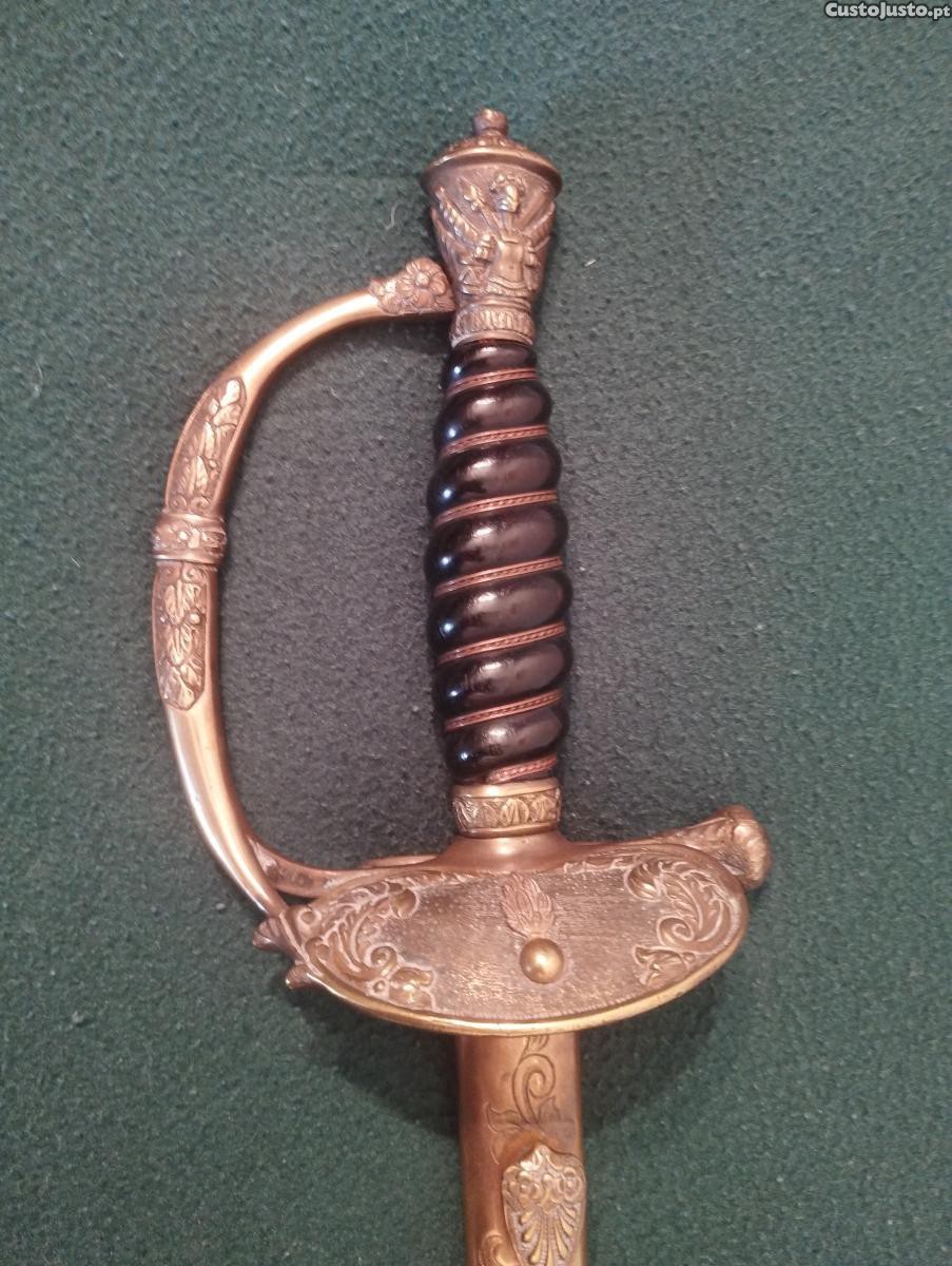 Espada de Oficial Granadeiro Português, modelo de 1885. Guarda em latão dourado com vareta cinzelada, punho em filigrana de chifre (ou madeira), contra-empunhadura fixa, lâmina reta de 78 cm, com bainha de couro (frágil na ponta), bocal gravado com motivos vegetalistas. A lâmina é datada de "Año de 1885" e "Fabricado em Toledo (Espanha). A lâmina é cinzelada com símbolos marciais de qualidade.