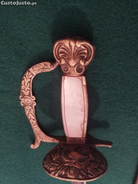 Espada infantil do século XIX. montagem em latão dourado com ramo cinzelado com capacete renascentista, punho em madrepérola (pequenas fissuras), lâmina reta de 33cm, com bainha em cobre cinzelado, duas braceletes (falta uma argola) lâmina gravada com símbolos vegetais. Comprimento ; 45cm Lâmina; 33cm