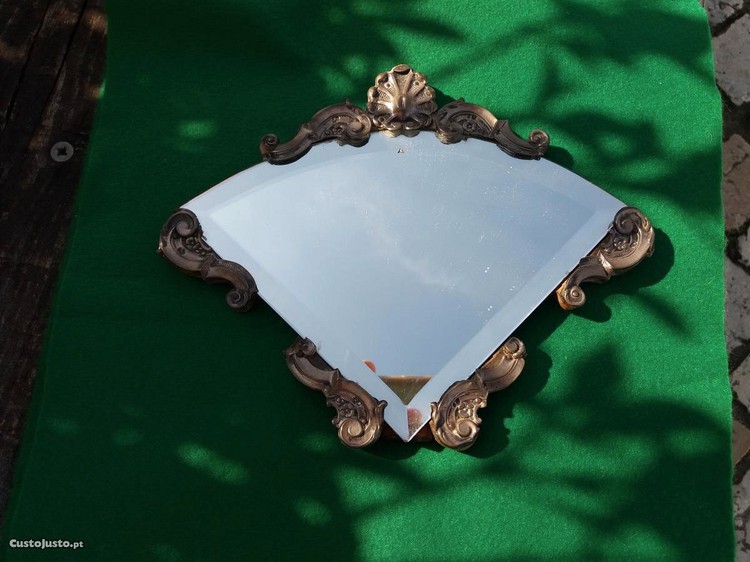 Espelho com 23 cm de larg por 15 alt com cinco molduras individuais a prata todas elas com respetivo contraste.Com pé posterior para colocar em cima de mesas.Peça anos 30 com mais ou menos 85 anos.Singular pelo formato raro maior parte destas peças são redondas.