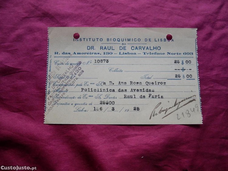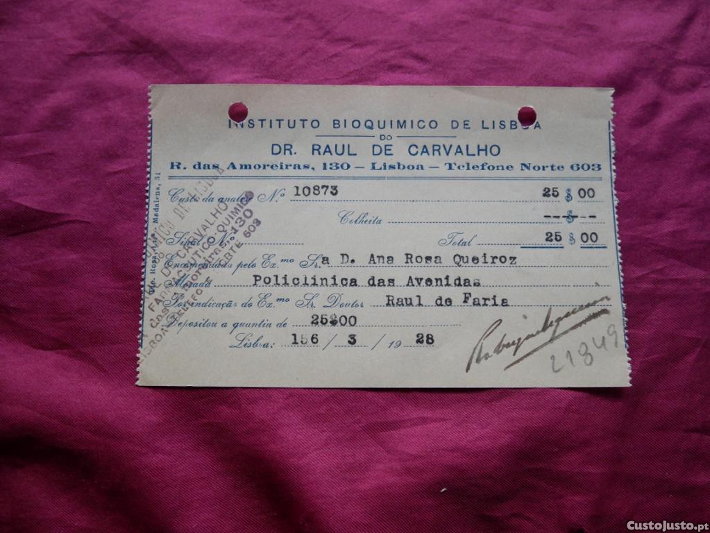 N 21849 Análise de pesquisa Bacilos de Koch em 1928. Instituto Bioquimico de Lisboa. 3 Recibos.