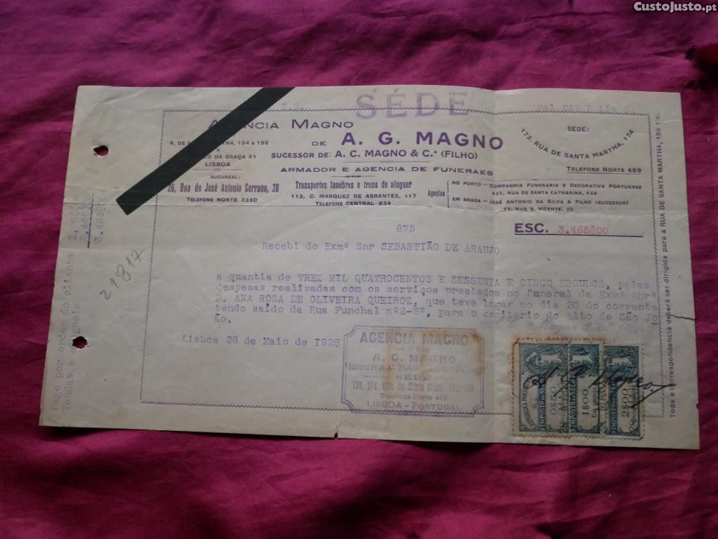 Factura e recibo da Agência Magno de 1928. 4 Selos Fiscais.