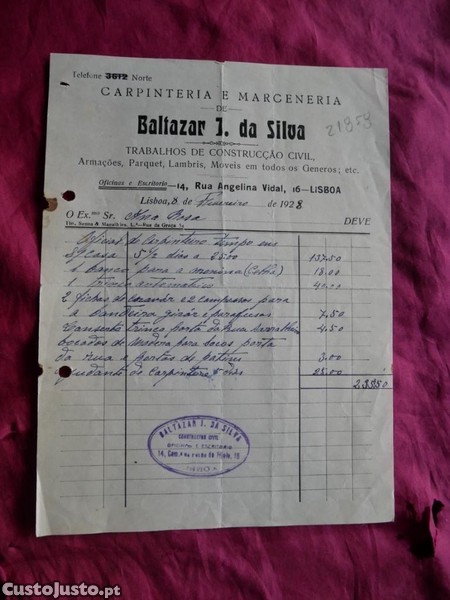 N 21858 Fatura de Carpintaria e Marcenaria de Baltazar J. da Silva 1928.