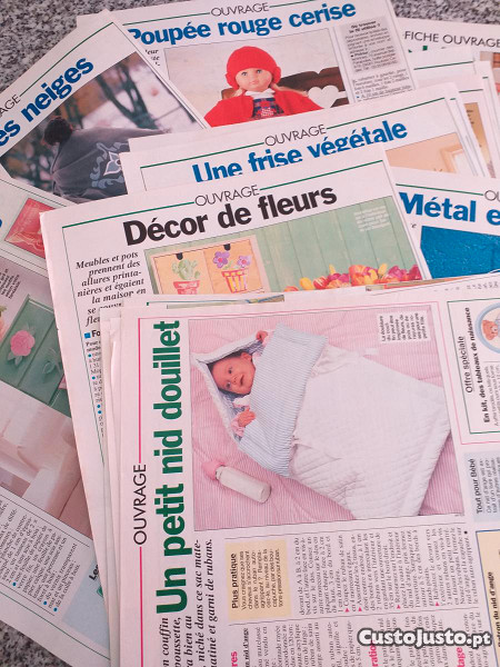 - 40 fichas de trabalho (em metal, vidro e mosaico, bordados, tricôs para bonecas, pintura com dedo, chapéus, para decorações em móveis, tecidos, parede..., costura para pequena estante, saco..., crochépara cortinas e naperons), em francês (EUR2)