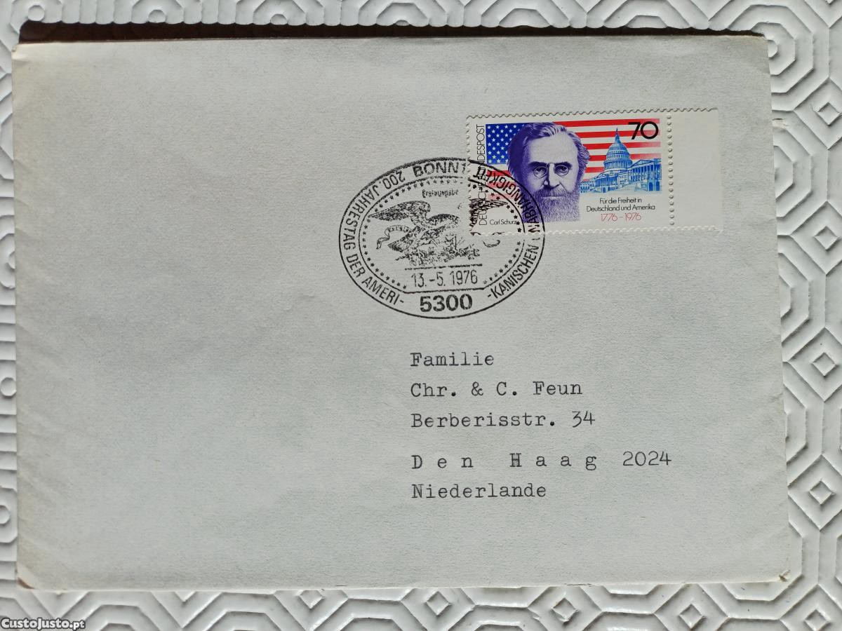 Filatelia - Envelope circulado com selo alemão alusivo ao Bicentenário dos EUA