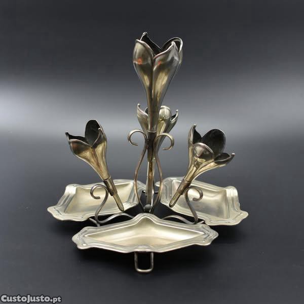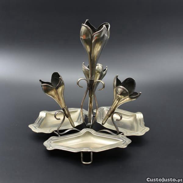 Floreira/Centro de mesa em metal prateado inglês, decoração estilo Art Nouveau. Com 4 jarras em forma de cálices de flor e 3 travessas amovíveis assentes num suporte. Marca Reg. Plato, E.P.N.S. Made in England (David Hollander & Sons). Século XX. Com sinais de oxidação.
