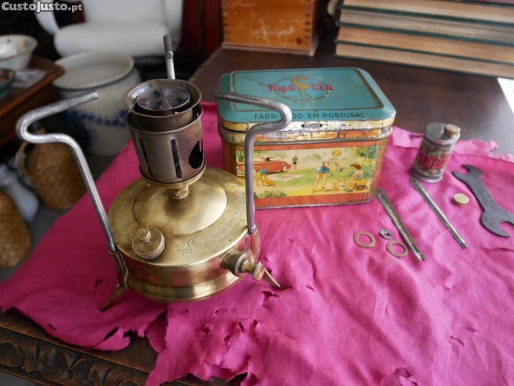 N 21878 Fogão Hipólito n 0, marcado, funcionamento a petróleo sob pressão, com respetivos acessários e caixa metálica litografada. Fogão: 16x16x19cm. Caixa: 17,5x14x11cm.