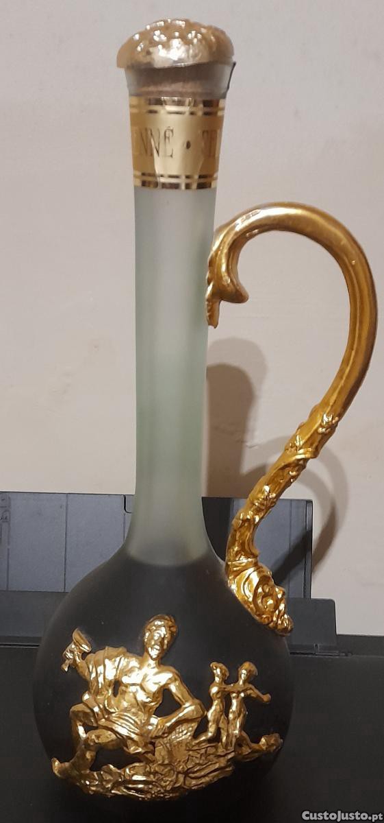 Garrafa longa com aplicações em estanho dourado, figuras em relevo e com 100 cl.