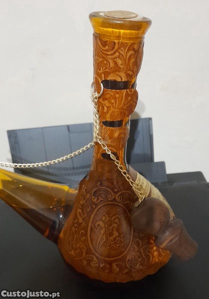 Garrafa vinho licoroso antiga em vidro com apliques couro - Bom estado