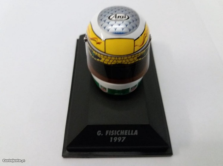 Miniatura de capacete da Minichamps, na escala 1:8, do piloto de Fórmula 1 Giancarlo Fisichella. Temporada de 1997, quando era piloto da Jordan. Sem tampa. Em muito bom estado.