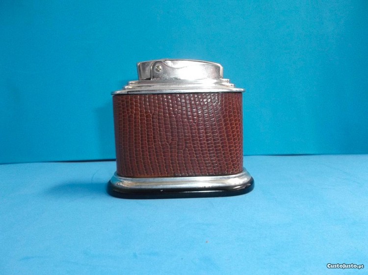 Vendo isqueiro de secretaria dos anos 50 da marca Rowenta Snip . Forrado a pele com o fundo em baquelite e aros em casquinha ( banho de prata ) . Funciona a gasolina está em bom estado . Medidas 9 cm compr. 8 cm alt. 4,5 cm larg. Inclui portes em correio normal .