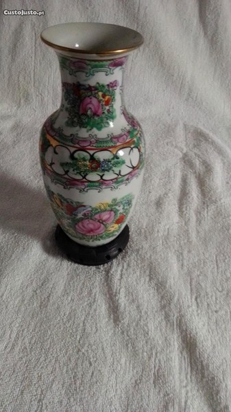 Linda jarra chinesa em porcelana, com base em madeira trabalhada.
