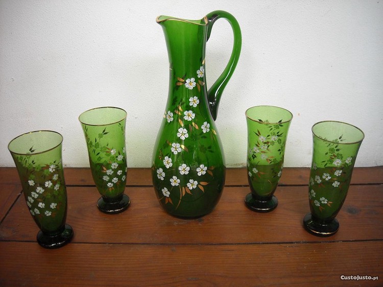 Conjunto muito antigo que inclui jarro e 4 copos altos em vidro gravado, como novo... passou toda a vida numa prateleira.