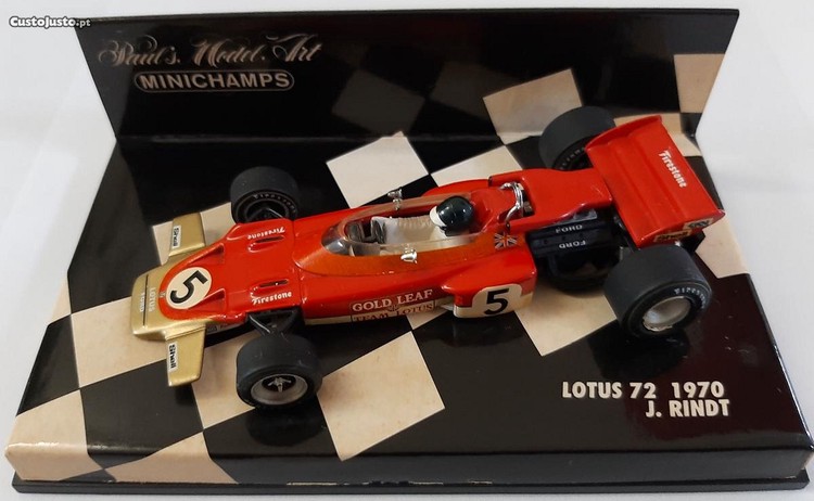 Miniatura de Fórmula 1 da marca Minichamps, na escala 1:43, do Lotus 72 de 1970, do piloto Jochen Rindt, que foi campeão do mundo nesse ano (o único campeão do mundo a título póstumo). Em bom estado.