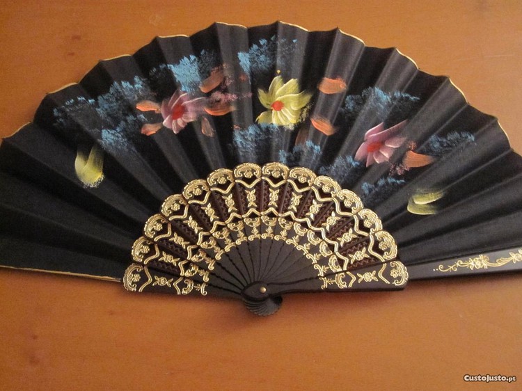 Preço: 30 €Leque Tecido Preto Flores Rosa e Amarelas P. Mão