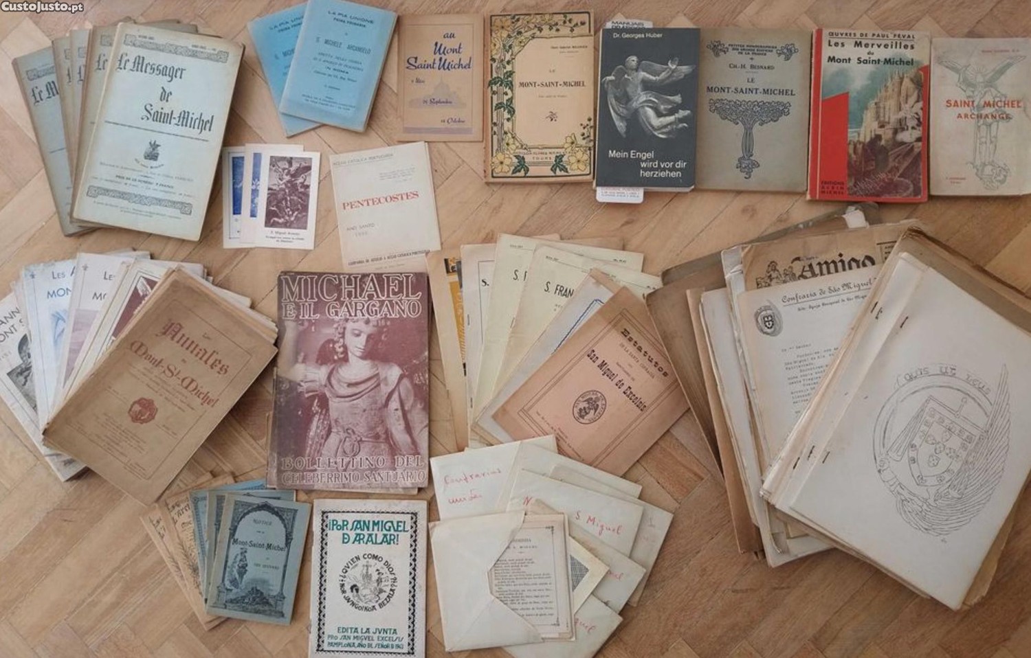 lote único com muitas dezenas de publicações e documentos sobre São Miguel Arcanjo, em várias línguas (português, espanhol, francês, inglês, italiano, alemão, etc.), alguns repetidos, todos muito antigos (anteriores à década de 1970), incluindo: