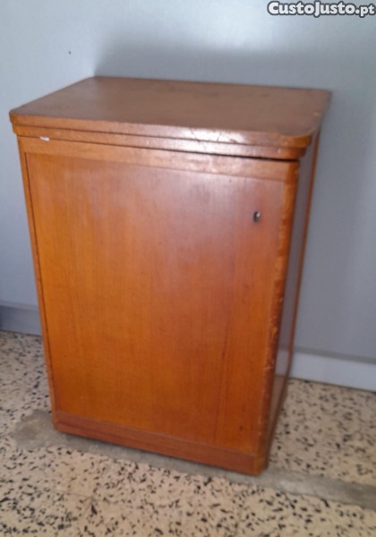 Máquina de Costura, 'Oliva', original, anos 60, adaptação de motor elétrico para maior facilidade de funcionamento, com pedal para regulação de velocidade, caixa com discos de pontos, com móvel, A79 x L42 x C57cm (extensível a 113cm), em pleno funcionamento.